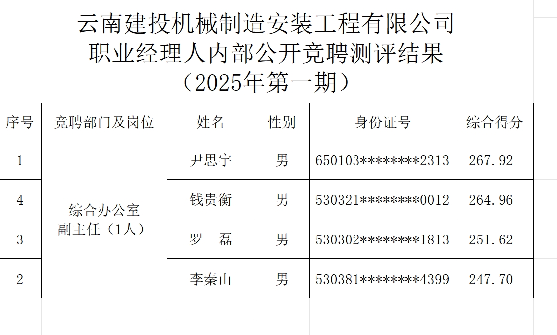 附件:云南建投機械制造安裝工程有限公司職業經理人內部公開競聘測評結果公示(2025年第一期)